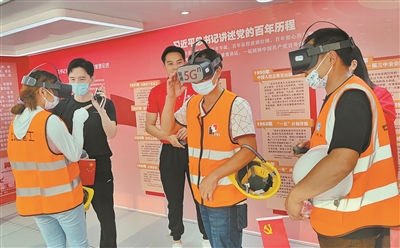 建筑工人通过VR互动体验了解党史。