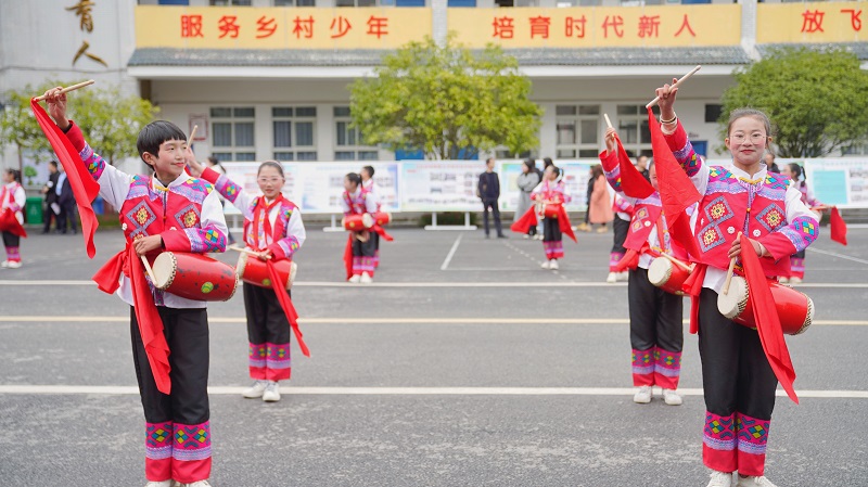 石柱县三河镇小学乡村学校少年宫活动项目与县情乡情相结合,开设摆手舞、啰儿调、土家腰鼓、竹铃球、莲箫、板凳龙等项目,让深厚的土家文化涵养每个孩子。