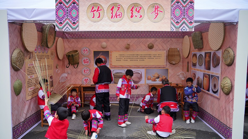 土家棕编、土家刺绣、土家米米茶、竹编织梦、舞动莲湘、线描工作坊、竹铃舞动……操场四周搭建起的集中展示区里,来自该校20多个社团的孩子们现场展示起了在乡村学校少年宫里学到的各种才艺。