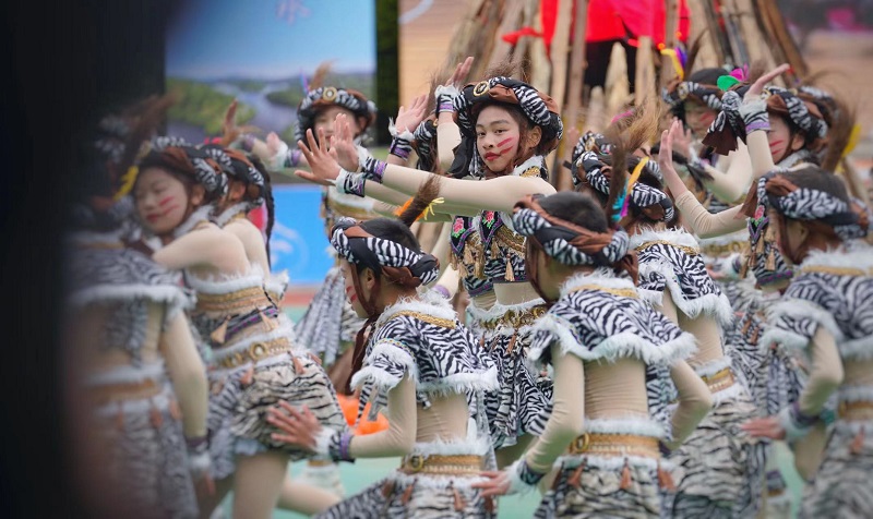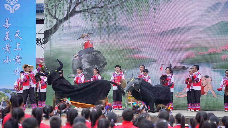 紧接着,土家啰儿调、土家舞狮、摆手舞等轮番上阵,博得现场阵阵掌声。学生们还带来了精彩的土家“玩牛”表演。一名放牛哥当起指挥者,引导牛儿“翩翩起舞”,完成吃草、擦痒、滚水、跳砍、傲角、犁田、喝水摆尾和骑牛等诙谐幽默的动作,锣鼓声、啰儿调、喝彩声,声声齐鸣。